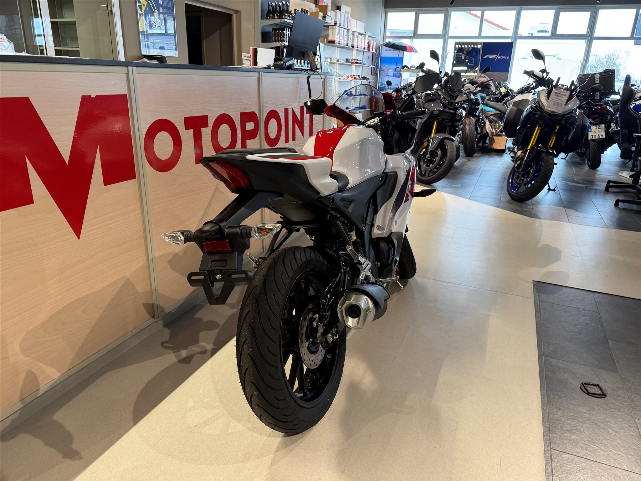 Der Deltabox-Rahmen hat eine für den Rennsport entwickelte Supersport-Geometrie und eine hochmoderne 41 mm KYB Upside-Down-Gabel sowie eine angelenkte Hinterradfederung für ein superagiles Handling. Die Anordnung der Fußrasten, der Sitzbank und des Lenkers sorgen für eine sportliche Sitzposition und für eine optimale Kontrolle. Und mit dem 5 Zoll großen TFT-Cockpit mit Smartphone-Konnektivität bleibst Du stets informiert und in Verbindung. Mit einem leistungsstarken, zentral angeordneten LED-Scheinwerfer, zwei LED-Positionsleuchten und der M-förmigen Nase spiegelt das aggressive, neue Gesicht die reine DNA der R-Serie wider.